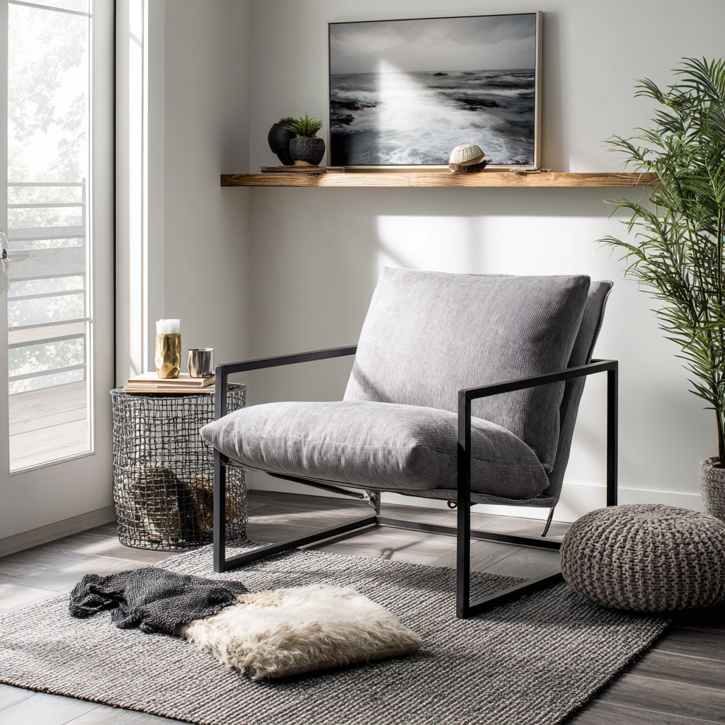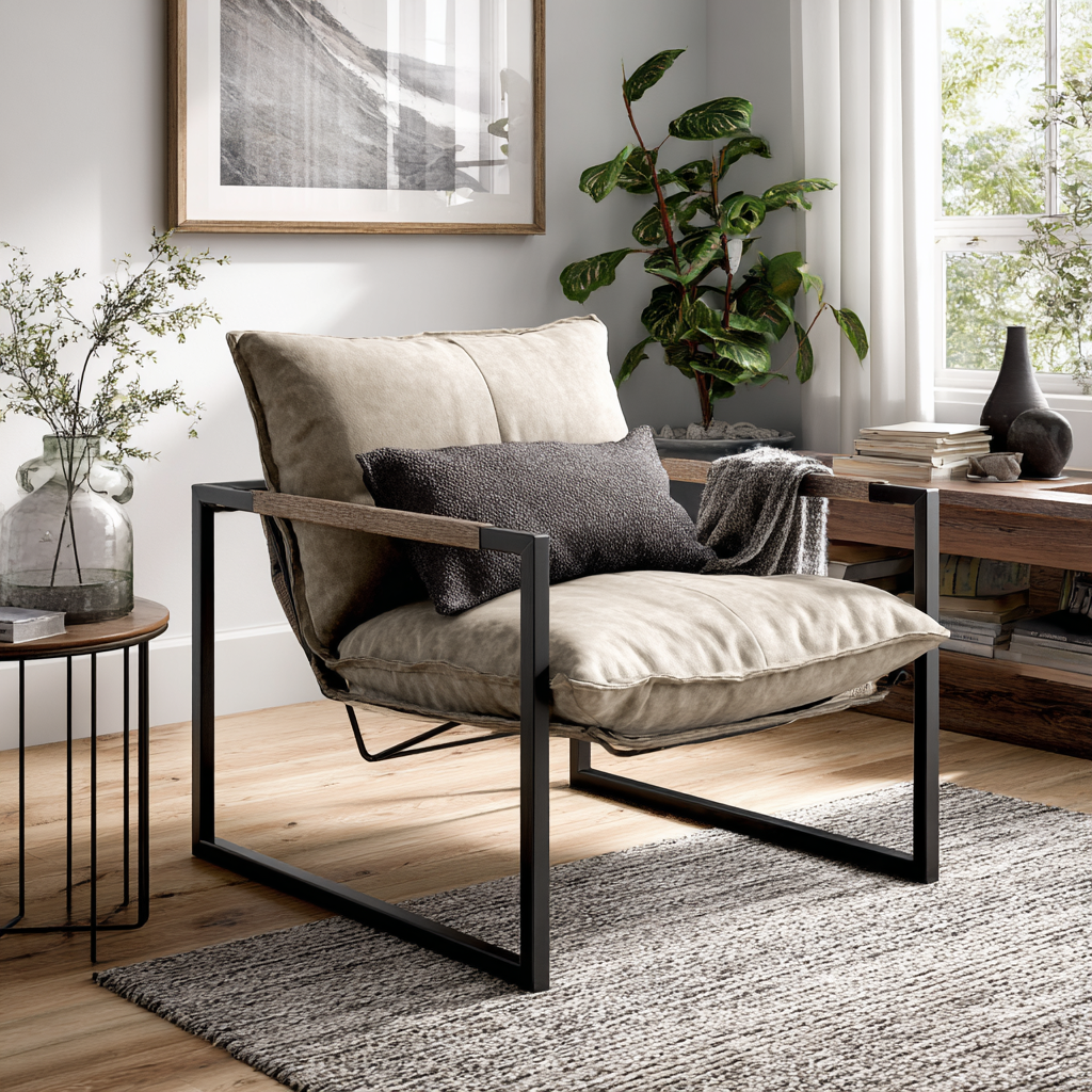 The floating cushion style of a modern sling chair brings clean lines to any living room. With its square black metal frame, this chair type mixes comfort with that cool, uncluttered look we all want. I love how it takes up visual space without feeling heavy – perfect if you’re going for that “less is more” vibe but still need somewhere comfy to sit. The simple design means it works with lots of different room styles too.