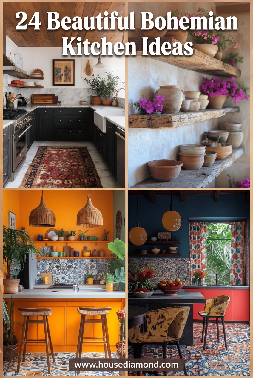 Ready to breathe new life into your kitchen? Transform your cooking space with these 24 Bohemian kitchen ideas—offering a creative blend of eclectic charm and modern design. From mixing midcentury modern furniture with vintage accents to using reclaimed wood for sustainable rustic touches, a Bohemian kitchen is all about creating a space that reflects your unique style. Explore how diverse cabinet styles, bold patterns, and vivid colors can make your kitchen not only functional but a beautiful expression of who you are. Get ready to reimagine your kitchen now!