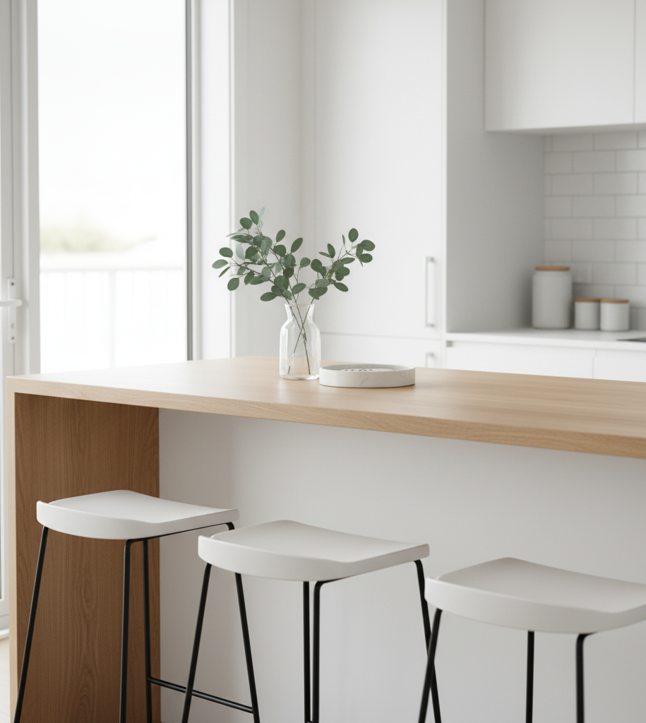Simple rectangular countertops in white or light wood instantly create a fresh, uncluttered vibe. Neutral palettes and low-profile stools keep the look sleek and functional. Stick to just a few essentials—think a single vase or a subtle tray—to maintain that airy, modern feel.