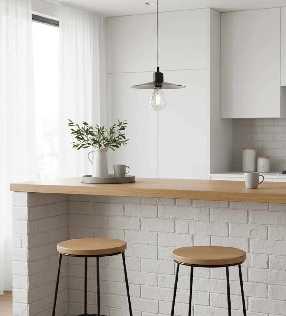 Pendant lights above your breakfast bar add instant character—choose industrial metals or classic glass to set the right vibe. Under-cabinet LEDs keep things bright for busy mornings, while recessed fixtures create a soft glow for evening hangouts. Layering these options turns your breakfast bar into a welcoming, stylish focal point.