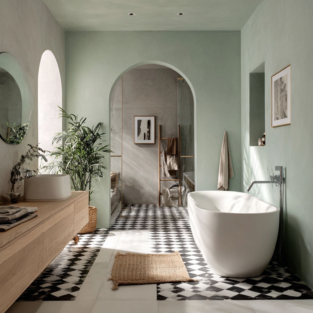 6. Sage-and-White Checkerboard Tile Bathroom Calm