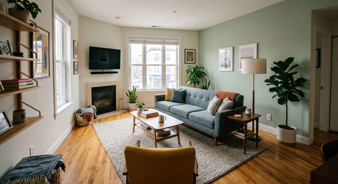 How can I make my apartment living room cozy without painting? Lean heavily on textiles and lighting. Hang floor-to-ceiling drapes, layer a vintage rug over your builder-grade carpet, and rely entirely on table lamps and floor lamps instead of overhead lighting.