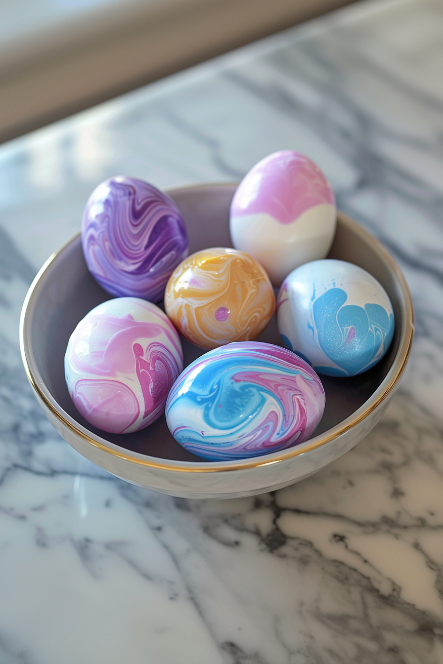 Marbled Eggs captivate the imagination, swirling with colors that seem to dance on the shell’s surface. This technique, blending beauty with mystery, turns each egg into a unique piece of art. Begin this project with a variety of nail polish colors, and let the water do the magic as you create fluid, marbled patterns.