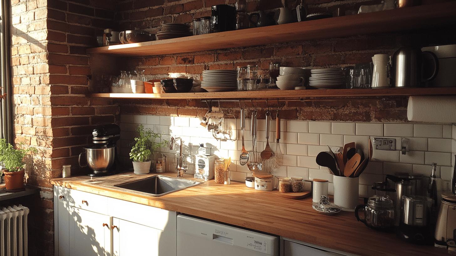 Wooden open shelving against exposed brick delivers both function and eye-catching style. Floating shelves keep kitchens feeling open—perfect for tight spaces—while showing off your favorite cookbooks, plants, or vintage finds. This setup makes storage part of the décor, turning your brick wall into a true kitchen highlight.