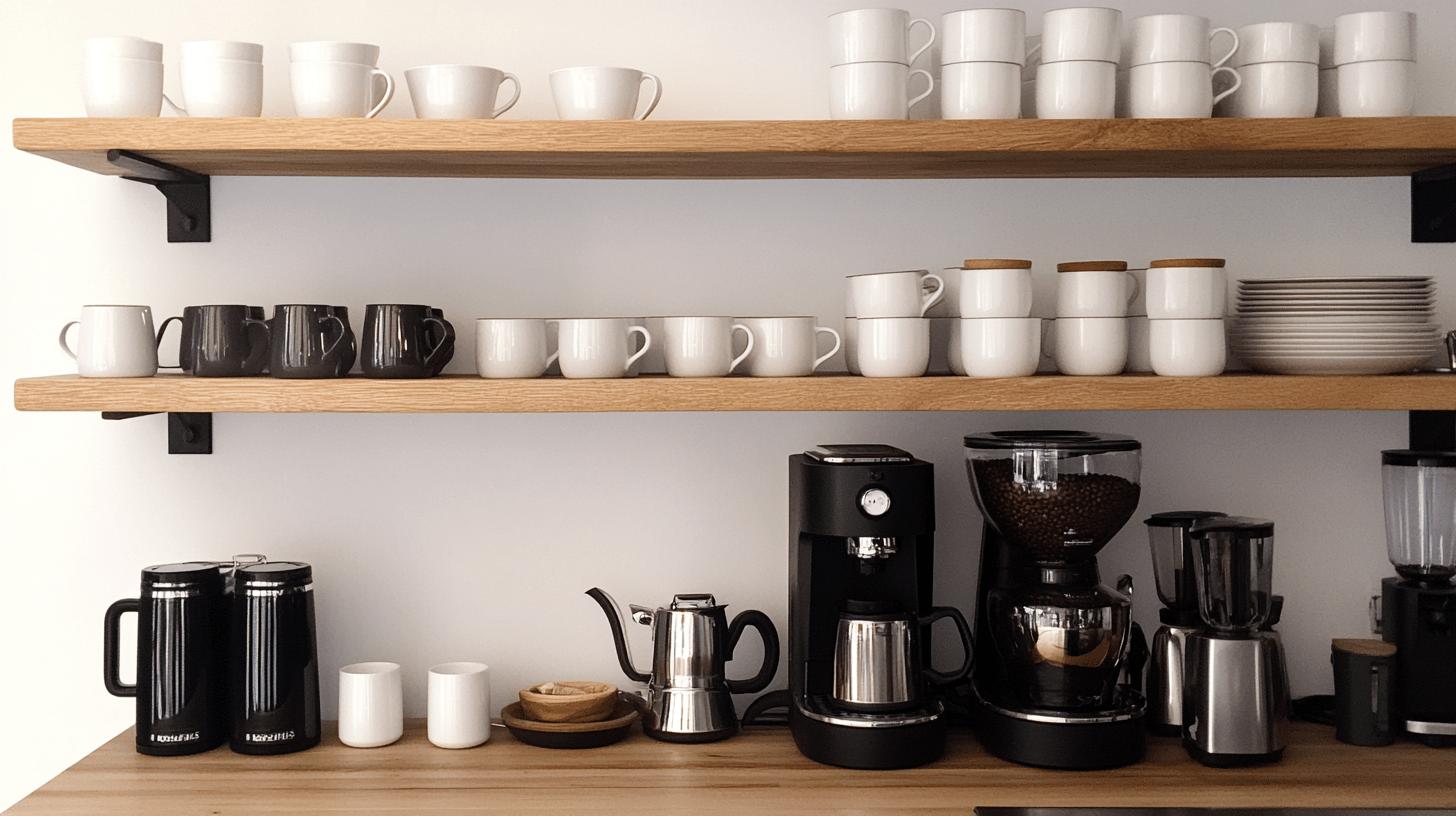 Utilize corners with compact shelving or wall-mounted racks. Choose small appliances and consolidated designs to keep your coffee area functional yet space-efficient.