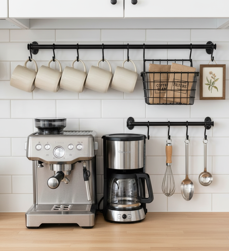 Free up your kitchen counter by installing metal rods or wall hooks above your coffee setup. Hang mugs, utensils, or even a small piece of art to keep accessories handy and show off your style. Vertical organization means more space for brewing—and your mug display doubles as decor.