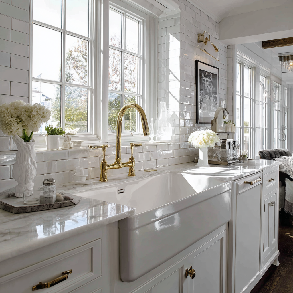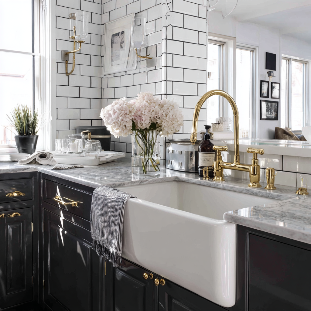 Apron-front sinks—sometimes called farmhouse sinks—bring that unmistakable classic look, especially in glossy porcelain. For even more charm, skirted sinks add a soft, country feel. Pair these with standout faucets in brass, chrome, or matte black, and the whole area feels instantly more special.
