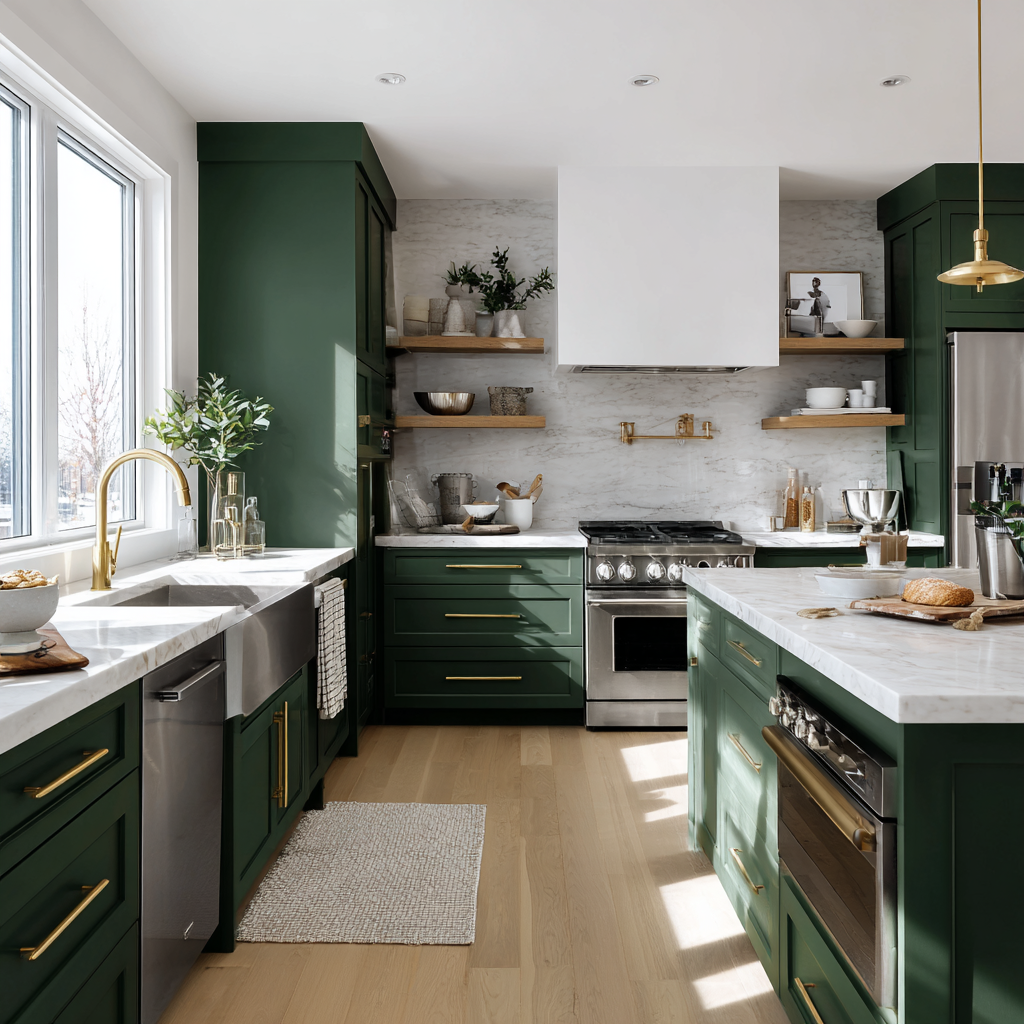 Rich green cabinets anchor a modern farmhouse kitchen with a grounded, nature-inspired feel. This bold color works especially well when paired with brass hardware and soft, neutral walls. The result is a fresh, sophisticated space that stands out but feels calm and easy to live in.