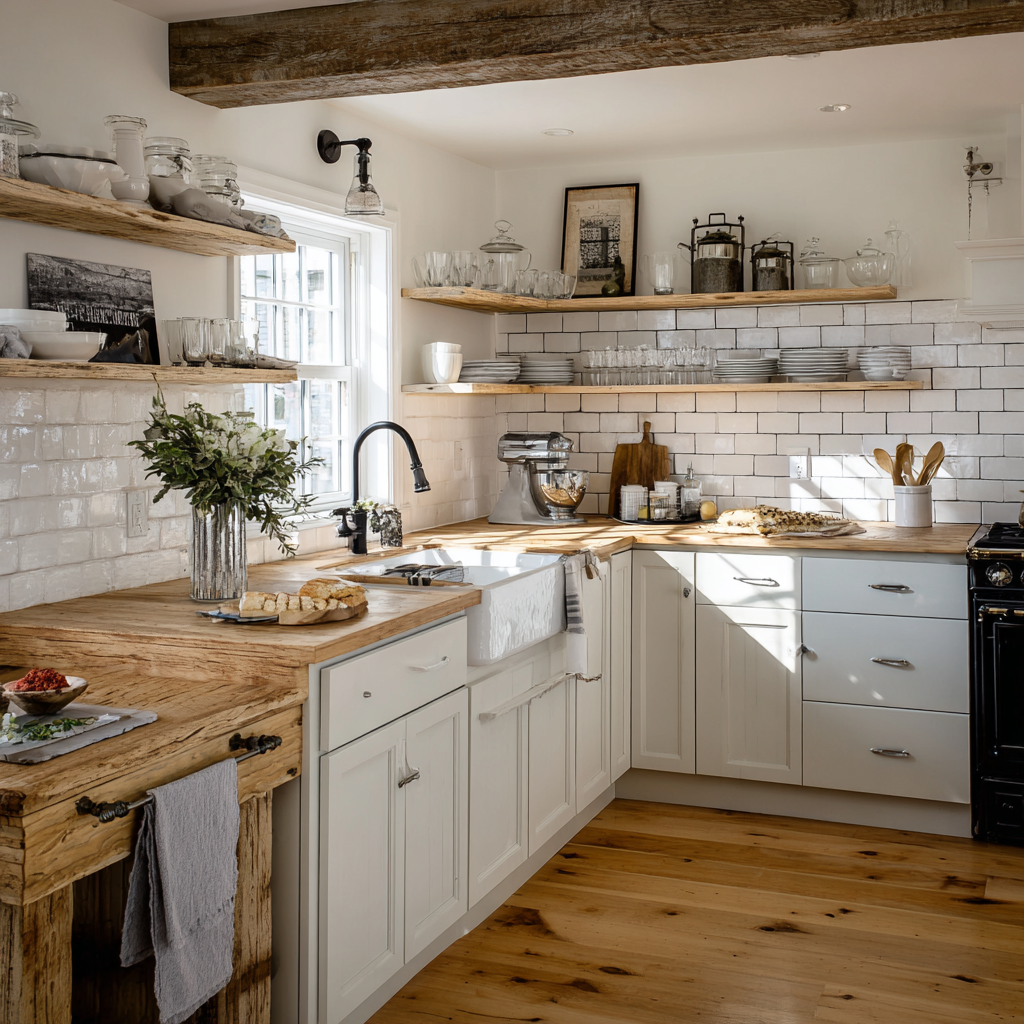 Shaker cabinets, open shelving, and vintage-style fixtures instantly add English country charm to a modern farmhouse kitchen. These touches blend old-world character with fresh, updated design. Think simple lines, classic hardware, and a few well-loved vintage kitchen accessories on display. It feels welcoming—like something you want to come home to.