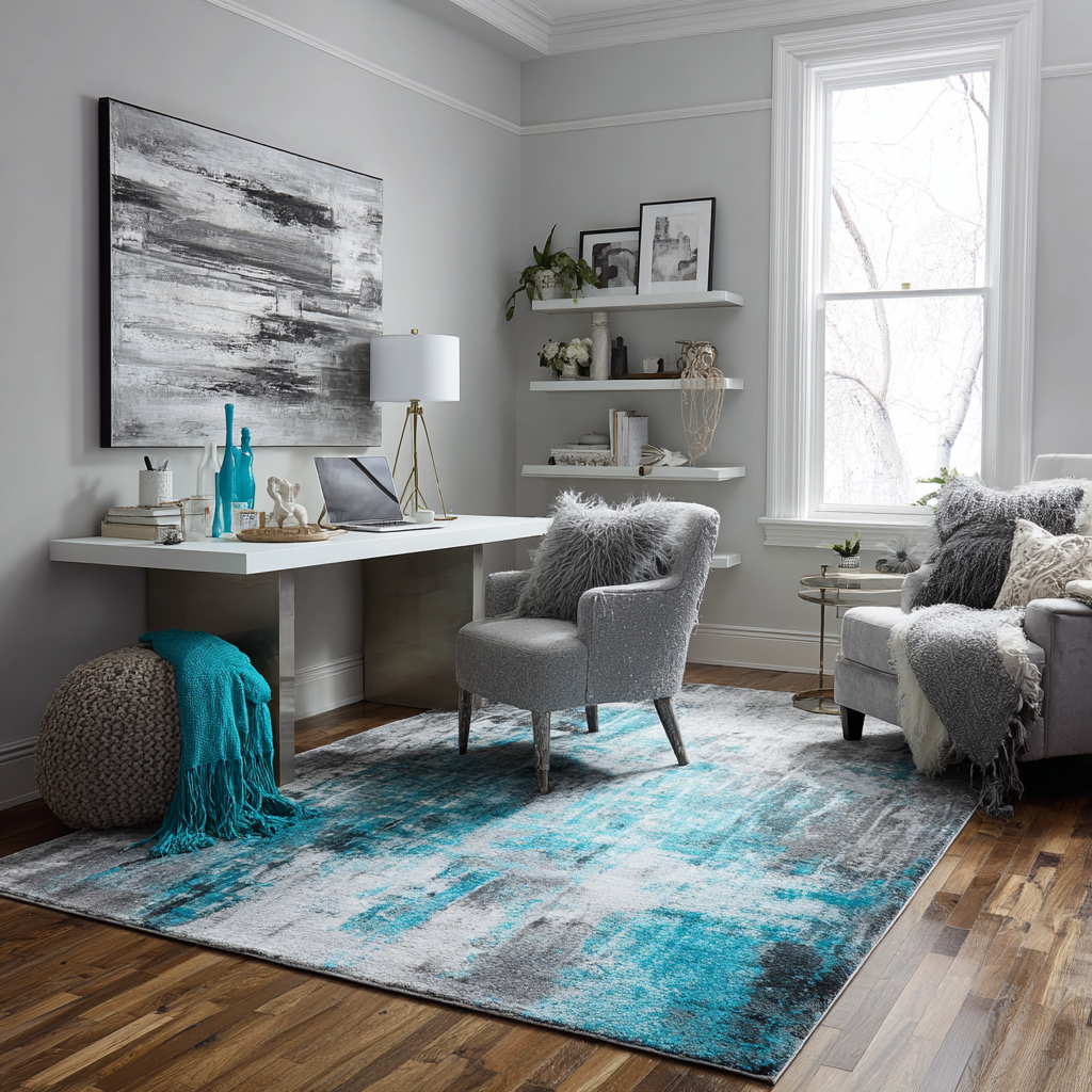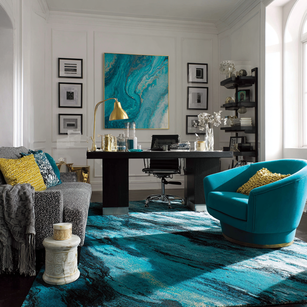 A bold rug—think deep turquoise or a splashy Art Deco print—grounds your workspace and gives it a clear sense of place. Add a few soft throws or textured pillows to keep things cozy and bright, bringing energy without making the room feel too busy.