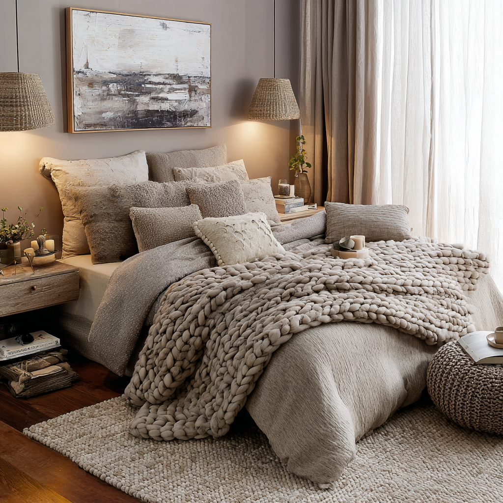 Layering taupe bedding—think duvets, blankets, and throw pillows in different shades—gives your bed instant depth and a cozy, inviting look. Mixing textures like linen, velvet, and chunky knits adds a luxe feel, making your bed the star of your taupe bedroom decor.