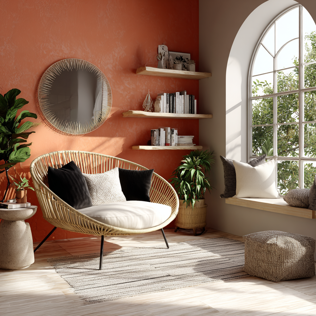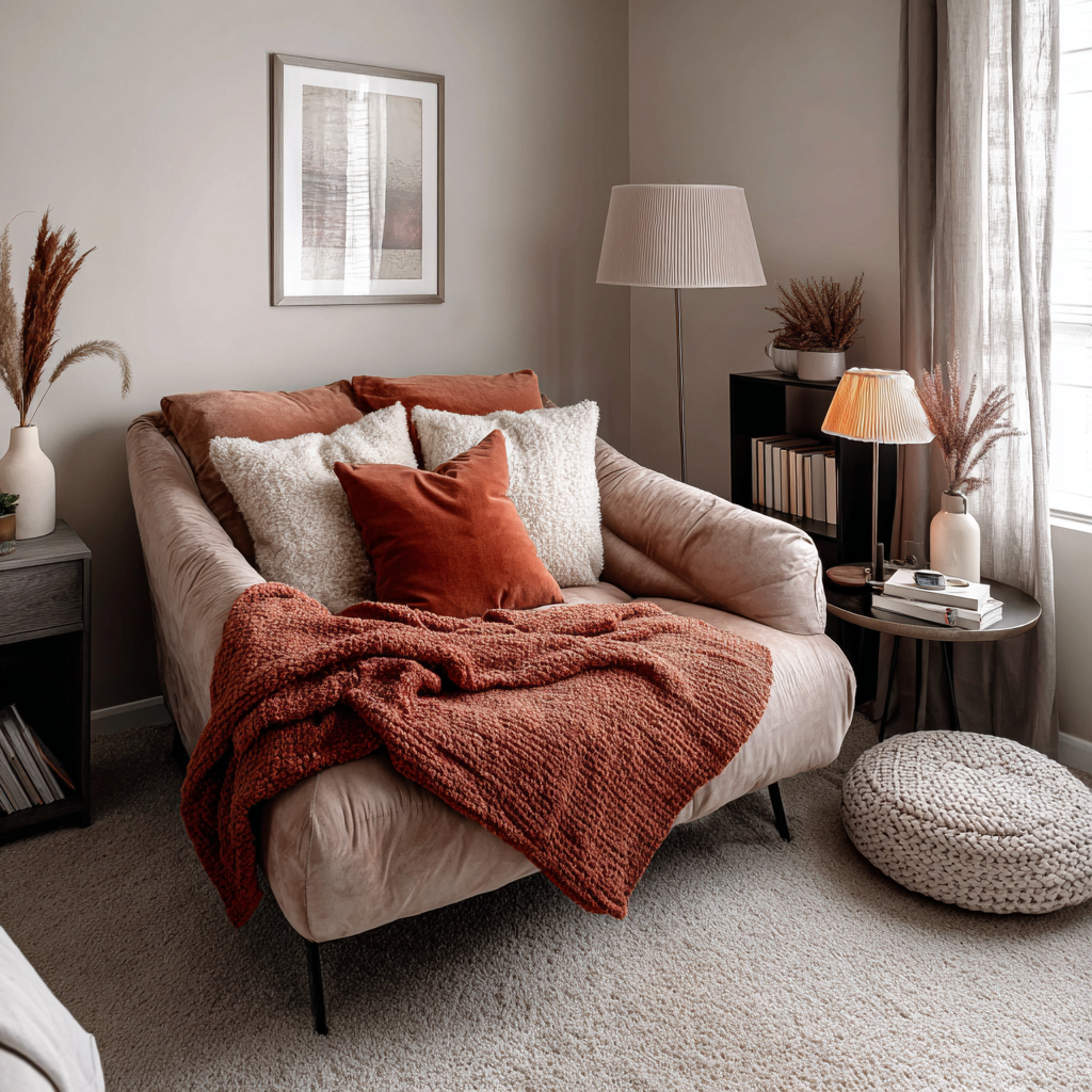 A: Add a terracotta throw, accent pillow, and a clay-toned lamp to a reading chair or corner bench. Pair with soft lighting and a small bookshelf for a cozy setup.