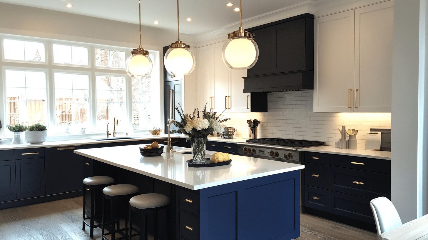 • Swapping all-white cabinets for navy lowers and white uppers instantly modernizes the look