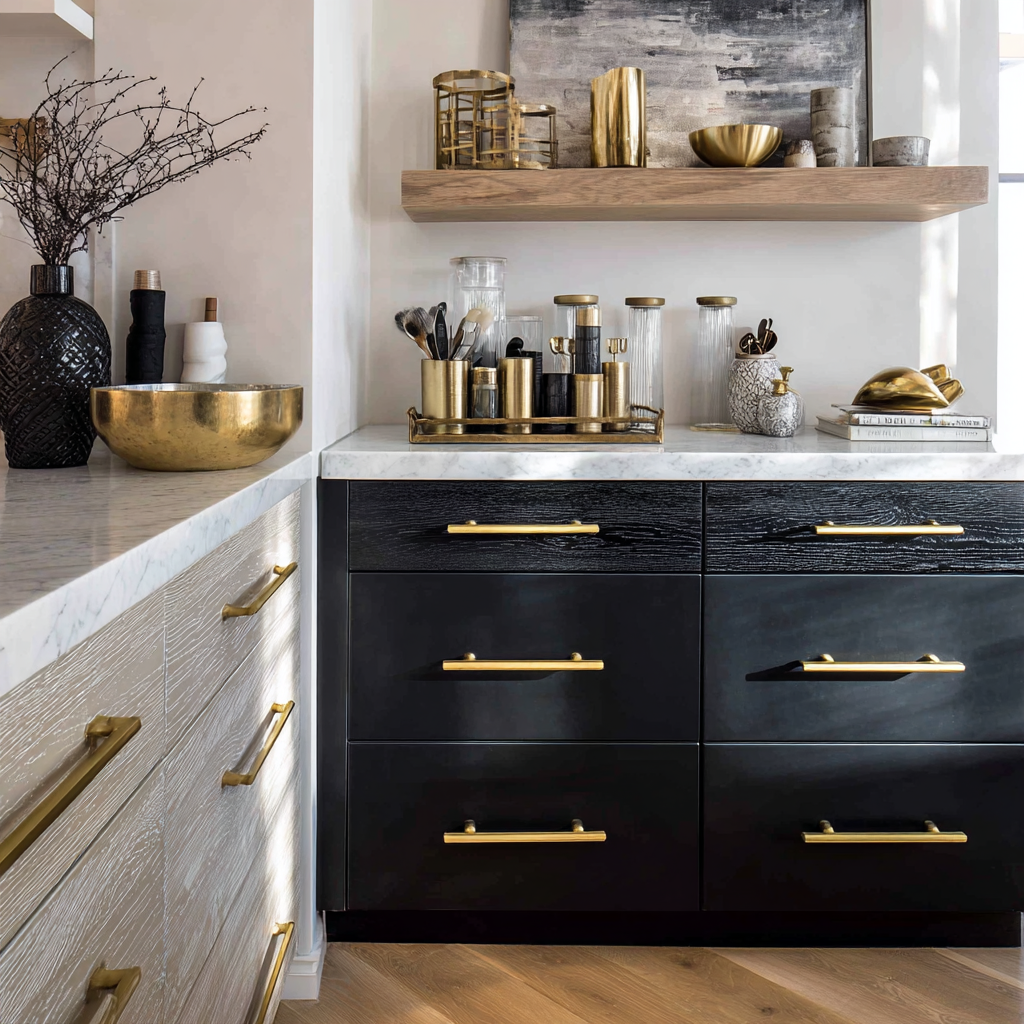 • Use brass or gold handles for warmth with both cabinet colors