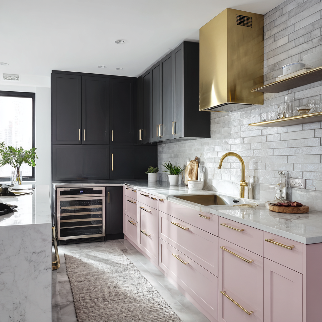 Modern two tone kitchen cabinets are all about sleek lines and sharp contrasts. Matte black lowers paired with glossy white uppers look striking and never go out of style. Integrated appliances and minimalist hardware keep the vibe seamless—think flat-front cabinets, handleless doors, and trending two tone cabinets that feel clean and fresh.