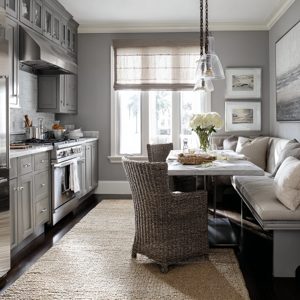 Swap in gray or beige kitchen rugs, linen runners, and soft window treatments to warm up your gray kitchen instantly. Layering cushy, woven fabrics—like cotton towels or textured seat cushions—brings comfort and coziness, making the space feel anything but sterile.